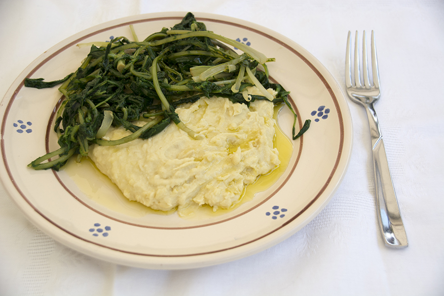 Impiattare il purè di fave, adagiare sopra le cicorie e condire con olio extravergine d’oliva crudo.